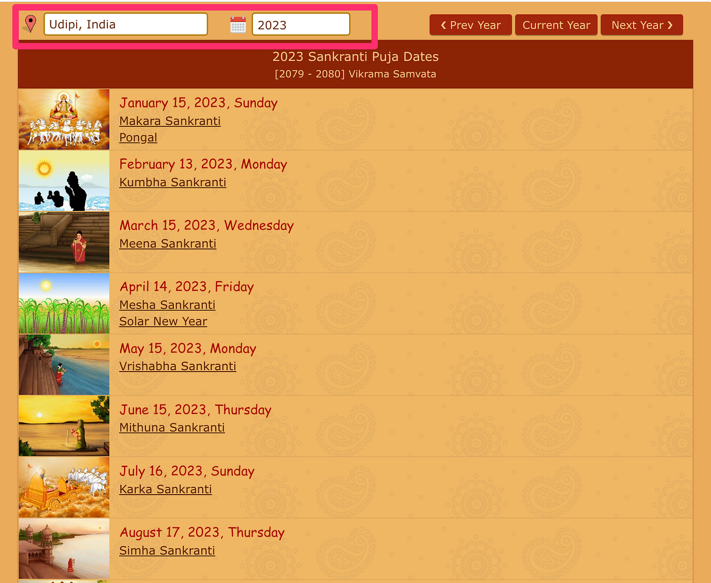 If it is too confusing how to find the Days of Saṅkramaṇa in the Deva.guru Panchanga, simply go to this page on the Drik Panchanga. Select your location and the year you’d like to look it up and mark the dates on your calendar!