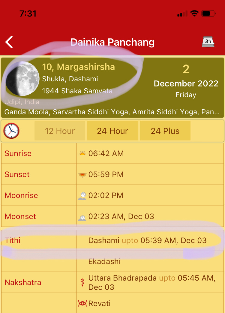 And just to show a variety of examples across the Panchangas, the same information in the Drik Panchanga app would be under “Tithi” of the day.