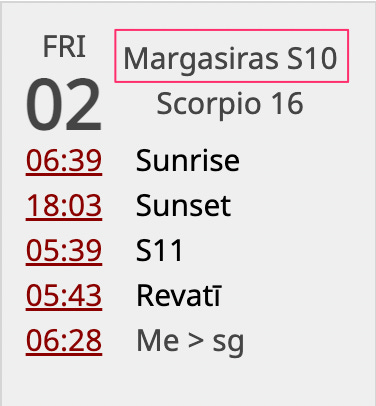The Lunar month is Margasiras (following the Mrigashīrsha Nakshatra). The Tithi is S10. In other words, Śukla Pakṣa Day 10. This is a good day to study. To calculate the non-study days, I would be looking for S1, S8, S14, S15 (Purṇimā) and the same days for Kṛṣṇa Pakṣa - K1, K8, K14, K15 (Amāvāsyā).