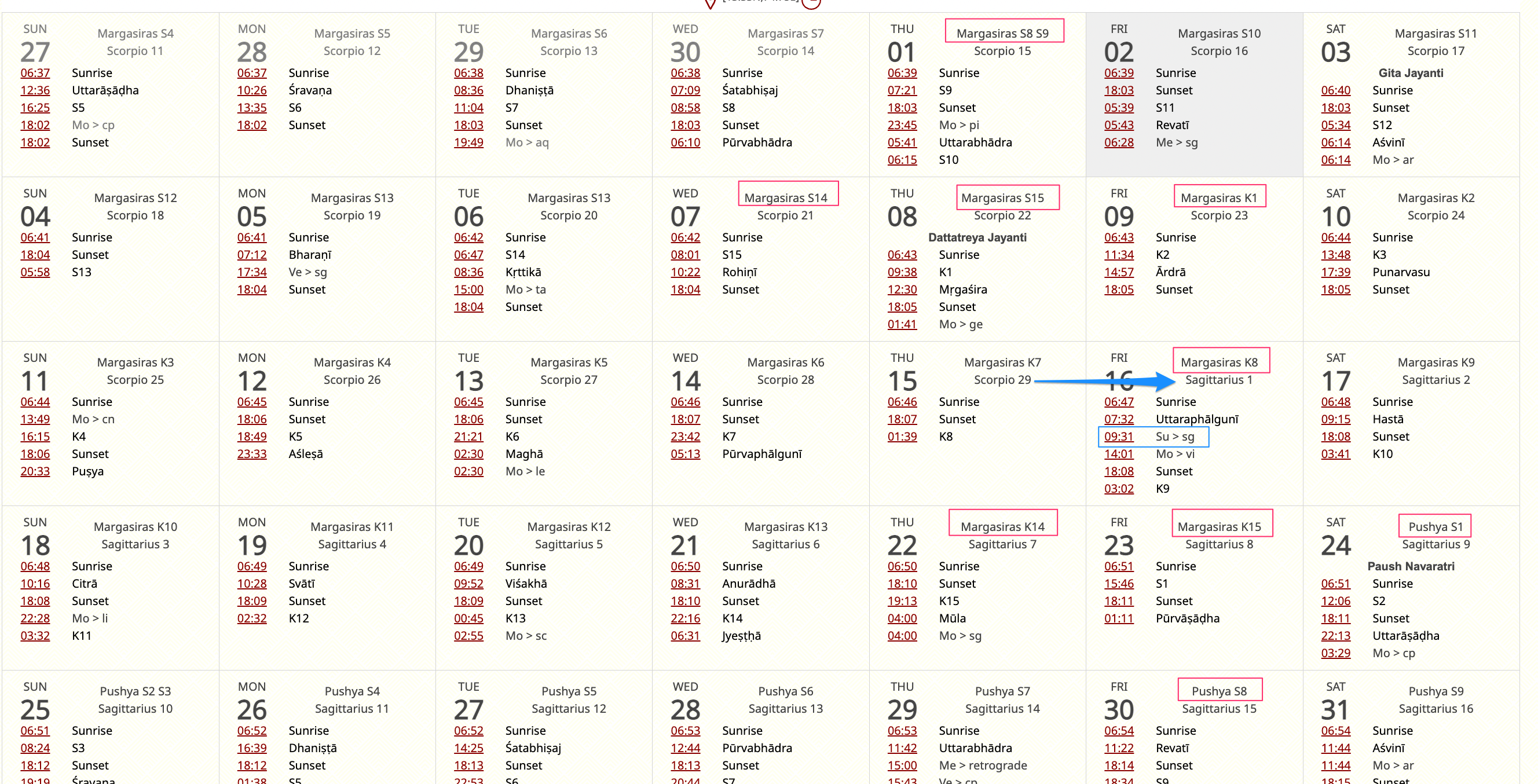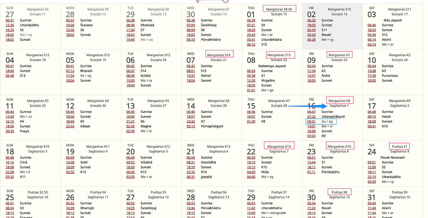 Decmeber 16th: Aṣṭamī - 8th (K8). Note that if you look under the Lunar Calendar information “Mrgasiras K7” or “Mrgasiras K8”, you will see the Solar Calendar information. In this case, you can see that the Sun is switching from Scorpio to Sagittarius on this day as well. So this will also be a non-study day based on Saṅkramaṇa. While in December, the Lunar and Solar non-study days fall on the same day, this might not always be the case.
