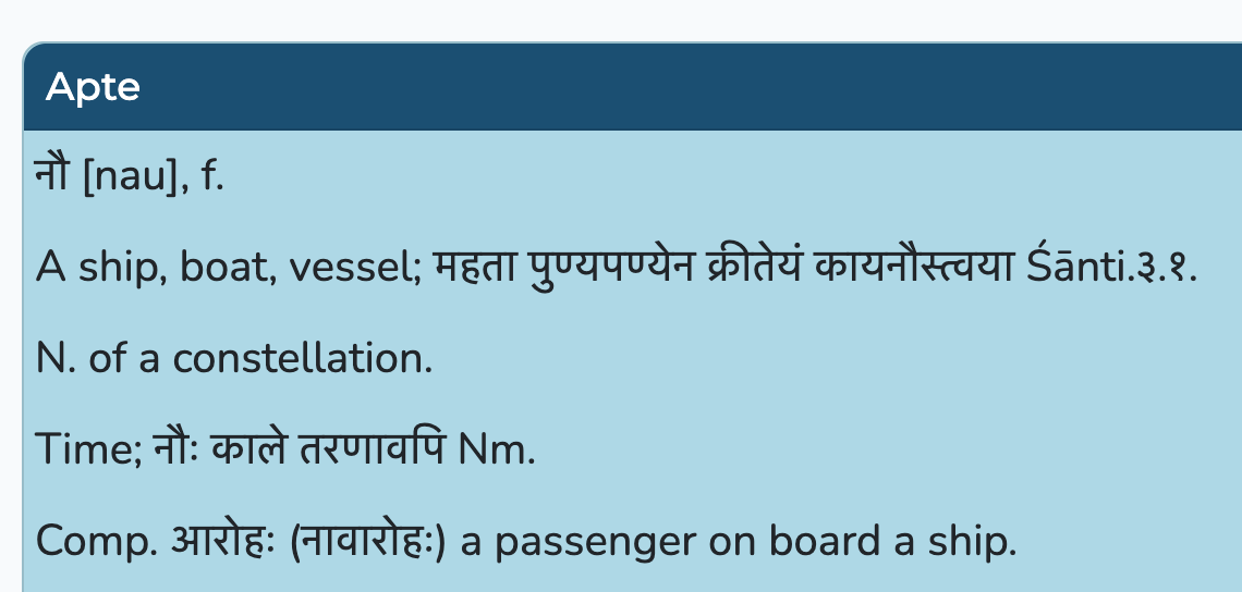 According to the commentary, it says नौस्तरिस्तस्यः, which is a sandhi that splits into नौः तरिः तस्यः - looking up तरिः in the dictionary also yields several meanings: