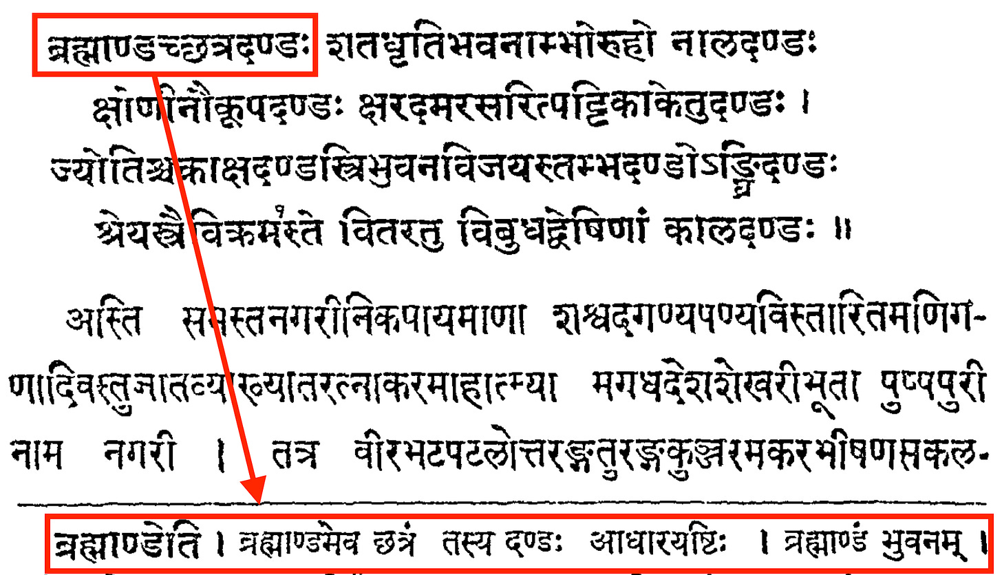 To break it down, we’ll start with ब्रह्माण्डच्छत्रदण्डः. The first thing to do is to look into the commentary: