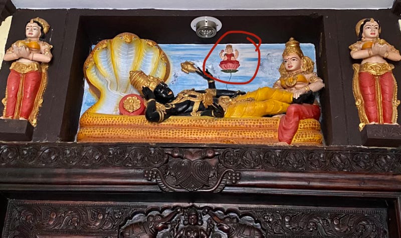 Back to imagination… Again, we know that this shloka is referring to Vamana. How is Vamana related to the Ganga? In Vamana’s story, when he becomes large (taking the Trivikrama form) and takes three steps, his second step goes into the Brahmanda (the universe), where his toe-nail cracks the vessel that is holding the Ganga, making the Ganga flow. This is the depiction of the event I saw at the Channakeshwara temple: