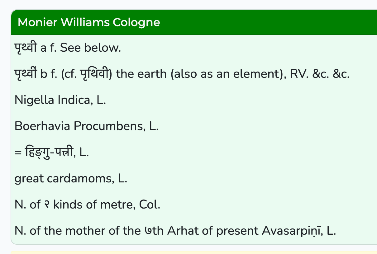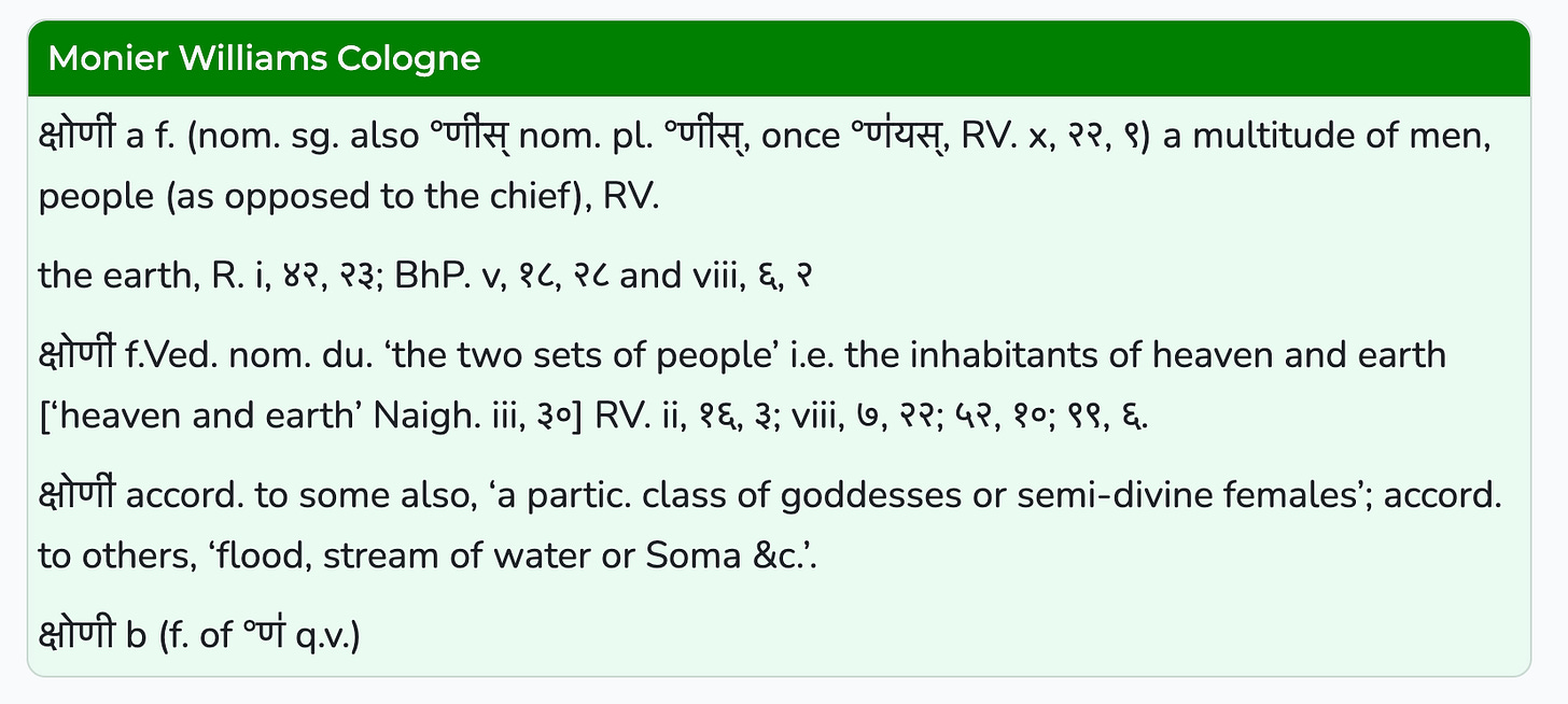 Here, क्षोणी is defined as पृथ्वी. Looking up पृथ्वी in the dictionary, we also get a variety of meanings: