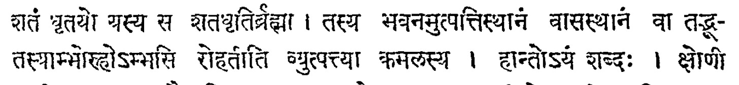 आम्भोरुहः = अम्भसि रोहति इति व्युत्पत्त्या कमलसय - the etymology of the word आम्भोरुहः, which refers to कमलसय, a lotus, is अम्भसि रोहति - that which rises out of water. Further, the word आम्भोरुहः is हान्तः अयं शब्दः, it ends with the letter ह्, with the root Pratipadika being अम्भोरुह्.