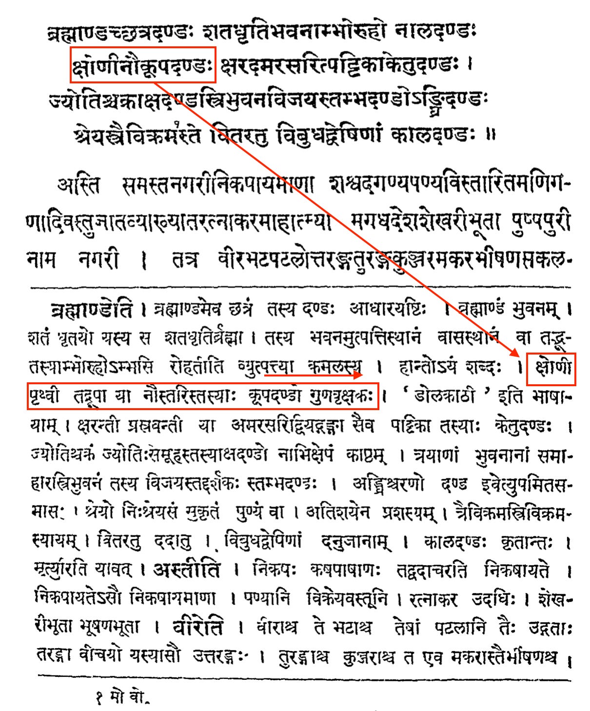 The word क्षोणीनौकूपदण्डः (kṣoṇīnaukūpadaṇḍaḥ) is a Samasa, a combination of different words of no declensions: